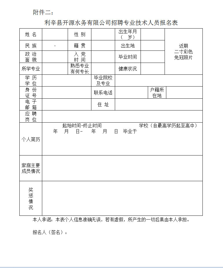 2、《利辛縣開源水務(wù)有限公司招聘專業(yè)技術(shù)人員報(bào)名表》