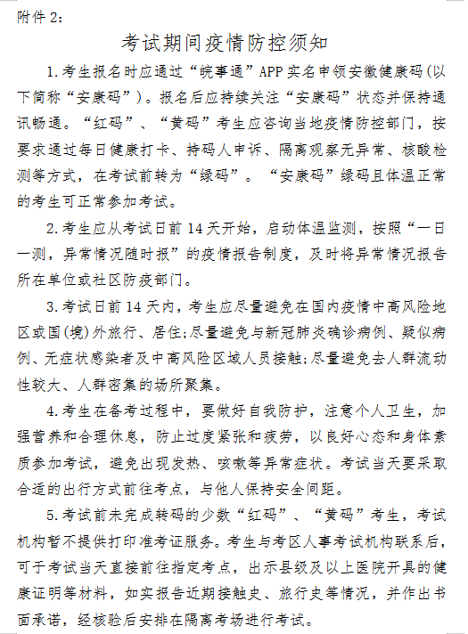 報(bào)考人員報(bào)名前,應(yīng)通過“皖事通”APP實(shí)名申領(lǐng)“安康碼”。報(bào)考人員報(bào)考前請認(rèn)真閱讀《考試期間疫情防控須知》(附件2)。報(bào)考人員提供的信息必須與本人實(shí)際情況、報(bào)考條件和所報(bào)考的崗位要求相一致。凡弄虛作假通過資格審查,其實(shí)際情況與報(bào)考條件規(guī)定不符的,一經(jīng)查實(shí),即取消考試、聘用等資格。
