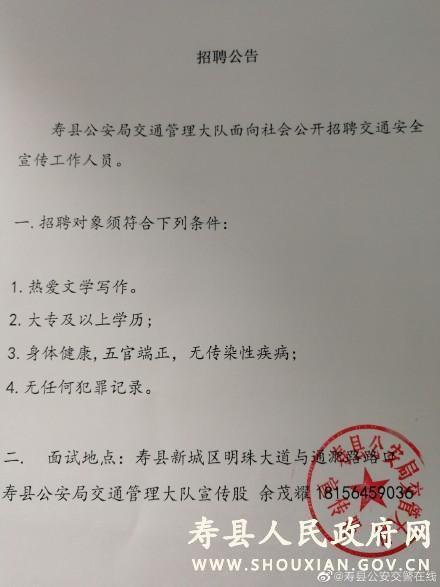 2020年淮南壽縣公安局交通管理大隊招聘交通安全宣傳工作人員公告