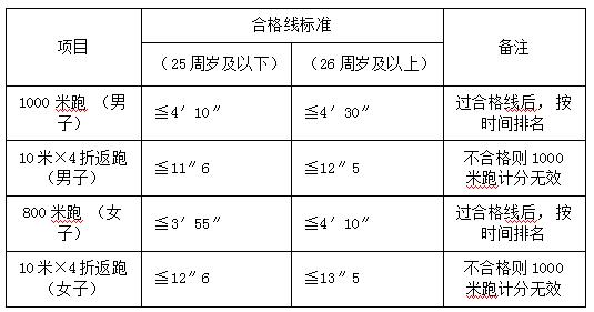 體能測試項目:男子1000米跑、女子800米跑,4×10米往返跑。測試標準參照《公安機關(guān)錄用人民警察體能測評項目和標準(暫行)》適當放寬。