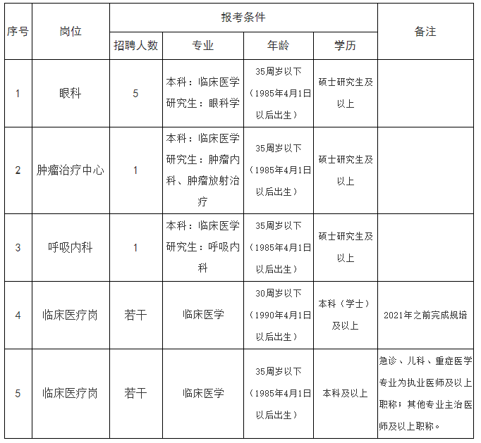 2021-03-31 19:29:49閱讀()安慶市第二人民醫(yī)院根據(jù)《事業(yè)單位人事管理?xiàng)l例》(國(guó)務(wù)院令第652號(hào))和中共安徽省委組織部、省人力資源和社會(huì)保障廳《關(guān)于印發(fā)<安徽省事業(yè)單位公開(kāi)招聘人員暫行辦法>的通知》(皖人社發(fā)〔2010〕78號(hào))等規(guī)定,現(xiàn)就2021年度安慶市第二人民醫(yī)院公開(kāi)招聘臨床專(zhuān)業(yè)碩博研究生及成熟人才有關(guān)事項(xiàng)公告如下: