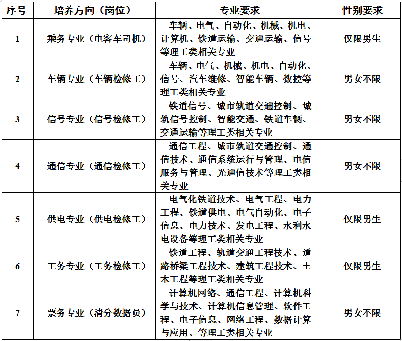 注:軌道交通相關(guān)專(zhuān)業(yè)優(yōu)先、具備相關(guān)技術(shù)崗位工作經(jīng)驗(yàn)優(yōu)先。每人限報(bào)一所院校一個(gè)專(zhuān)業(yè),重復(fù)報(bào)名視為無(wú)效。
