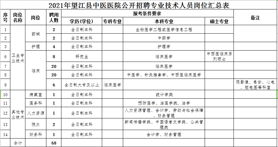 招聘崗位計(jì)劃數(shù)68個(gè),具體招聘專(zhuān)業(yè)、人數(shù)、資格條件等見(jiàn)《2021年望江縣中醫(yī)醫(yī)院公開(kāi)招聘專(zhuān)業(yè)技術(shù)人員崗位表》(附件1)。