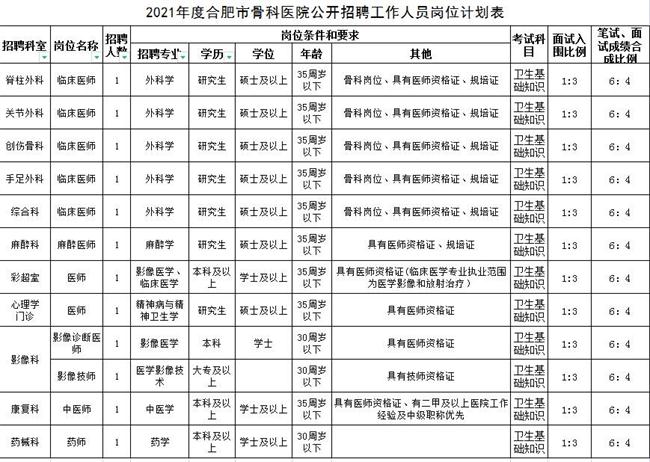 合肥市骨科醫(yī)院公開招聘12名工作人員,具體招聘崗位及條件見《2021年度合肥市骨科醫(yī)院公開招聘工作人員崗位計(jì)劃表》(附件1)。