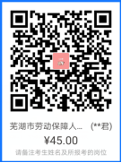 3. 掃碼繳費。應聘者掃碼繳納報名費用45元。請用支付寶掃碼后添加備注,注明考生姓名、報考崗位。根據(jù)安徽省財政廳、安徽省物價局財綜〔2013〕2568號文件規(guī)定,按每人每科45元標準收取筆試費用。享受國家最低生活保障金城鎮(zhèn)家庭和農(nóng)村特困家庭的報考人員享受減免考試費用政策(先交后退,退費時需提供相關材料)。