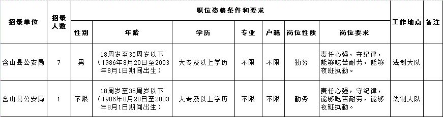 本次招聘警務(wù)輔助人員8名,具體職位見(jiàn)《馬鞍山市公安局含山片區(qū)招聘警務(wù)輔助人員職位表》(附件1)。
