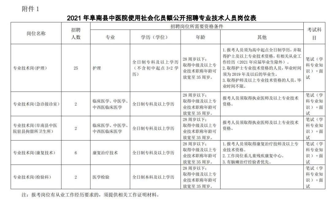 附件1:《2021年阜南縣中醫(yī)院使用社會化員額公開招聘專業(yè)技術(shù)人員崗位表》