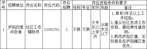 因工作需要,經(jīng)研究同意,委托遠(yuǎn)創(chuàng)人力資源管理集團(tuán)有限公司,公開招聘廬陽區(qū)四里河街道社區(qū)工作輔助崗人員1名?,F(xiàn)就有關(guān)事項公告如下: