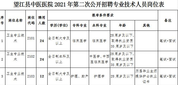2021-12-14 22:01:56閱讀()望江縣中醫(yī)醫(yī)院為建立滿足發(fā)展需求的專業(yè)技術(shù)人才隊(duì)伍,根據(jù)《安徽省事業(yè)單位公開招聘人員暫行辦法》(皖人社發(fā)〔2010〕78號(hào))、《關(guān)于印發(fā)〈創(chuàng)新編制管理建立公立醫(yī)院編制周轉(zhuǎn)池制度試點(diǎn)方案〉的通知》(皖編辦〔2017〕59號(hào))、《關(guān)于批轉(zhuǎn)望江縣完善縣級(jí)公立醫(yī)院人事薪酬制度實(shí)施細(xì)則的通知》(望政辦秘〔2017〕23號(hào))等相關(guān)規(guī)定,經(jīng)研究決定,開展望江縣中醫(yī)醫(yī)院2021年第二次公開招聘專業(yè)技術(shù)人員工作。具體公告如下: