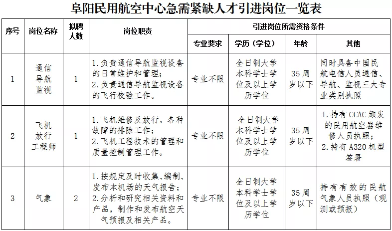 根據(jù)阜陽民航快速發(fā)展需要,阜陽民用航空中心現(xiàn)面向社會(huì)公開引進(jìn)3個(gè)崗位4名急需緊缺人才,現(xiàn)公告如下: