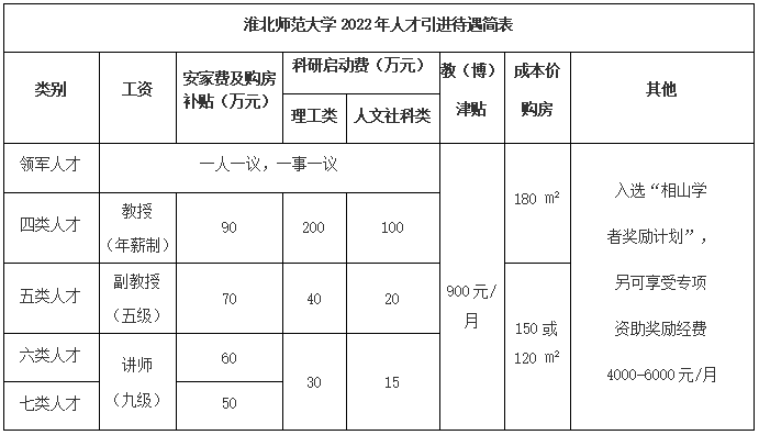 2. 四類至七類人才:引進(jìn)的四類至七類人才享受《淮北師范大學(xué)人才引進(jìn)待遇簡(jiǎn)表》中相應(yīng)的安家費(fèi)及購房補(bǔ)貼、科研啟動(dòng)費(fèi)、教授(博士)津貼、成本價(jià)購房等待遇;其配偶具有學(xué)士及以上學(xué)位,可在校內(nèi)安排工作。同時(shí),聘期(6年)內(nèi)入選“相山學(xué)者獎(jiǎng)勵(lì)計(jì)劃”,另可享受專項(xiàng)資助獎(jiǎng)勵(lì)經(jīng)費(fèi)4000-6000元/月。引進(jìn)人才的具體聘期任務(wù)及待遇以雙方合同約定為準(zhǔn)(教育部重點(diǎn)實(shí)驗(yàn)室聘用人才的待遇另行約定)。