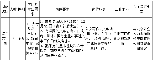 因工作需要,合肥市自然資源和規(guī)劃局招聘政府購買崗位服務人員3名。具體如下 :