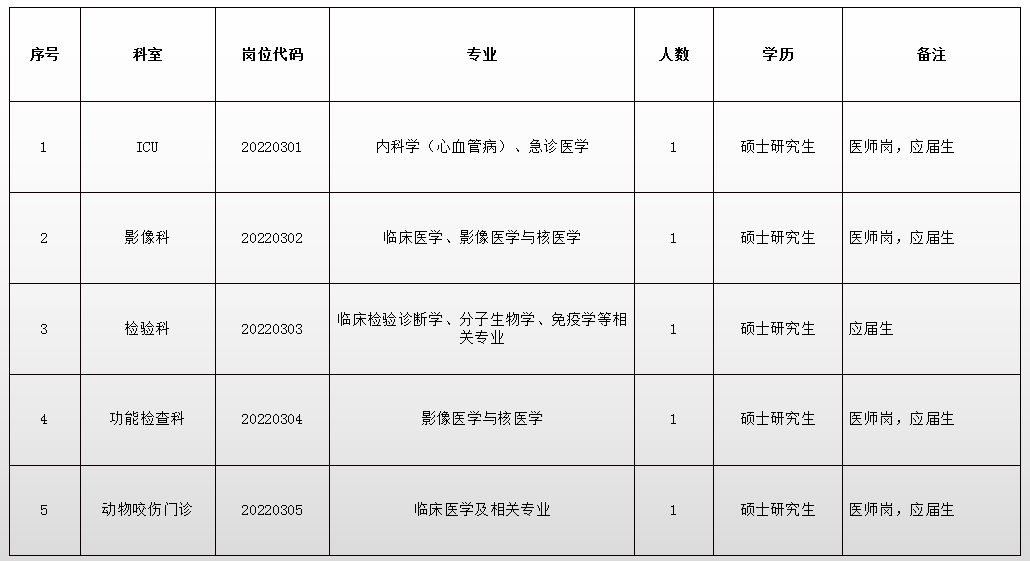 (五)專業(yè):專業(yè)對口,醫(yī)學(xué)類崗位要求本科專業(yè)為5年制/4年制臨床醫(yī)學(xué)或與碩士研究生專業(yè)一致,非醫(yī)學(xué)類崗位要求本科專業(yè)與碩士研究生專業(yè)或崗位相關(guān)。