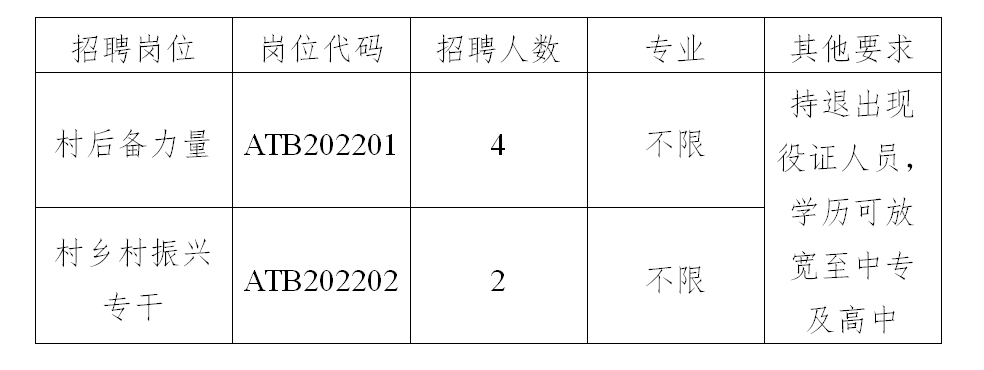 因工作需要,經(jīng)研究,現(xiàn)面向社會公開招聘4名村級后備力量和2名鄉(xiāng)村振興專干,現(xiàn)將有關事項公告如下: