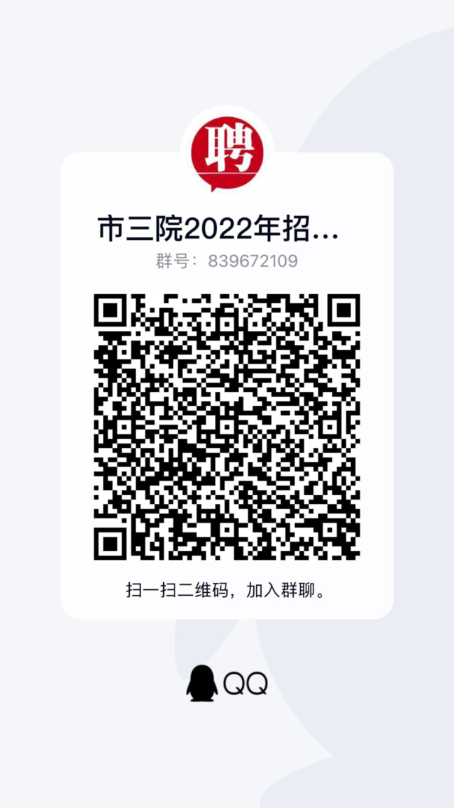 因疫情影響,報(bào)名采取網(wǎng)上報(bào)名方式。報(bào)名人員可通過銅陵市第三人民醫(yī)院網(wǎng)站(網(wǎng)址:http://www.tl-sy.com/)或掃碼進(jìn)群查看招聘信息,下載招聘人員報(bào)名表,填寫完畢后發(fā)送至電子郵箱635423407@qq.com,同時(shí)附身份證、畢業(yè)證書、學(xué)位證書、執(zhí)業(yè)資格證書、學(xué)校就業(yè)推薦表等掃描件。