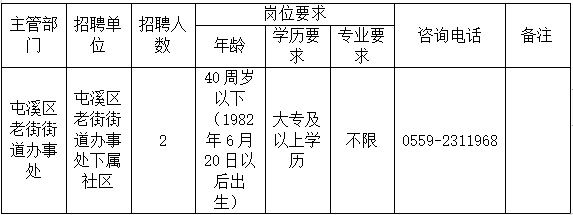 為切實(shí)加強(qiáng)街道工作人員的隊(duì)伍管理和建設(shè),解決工作人員不足問(wèn)題,根據(jù)《屯溪區(qū)機(jī)關(guān)事業(yè)單位編外人員管理辦法》規(guī)定和要求,結(jié)合屯溪區(qū)老街街道辦事處工作實(shí)際所需,經(jīng)核準(zhǔn),屯溪區(qū)老街街道辦事處委托黃山市仁和人力資源服務(wù)有限公司面向社會(huì)公開招聘2名社區(qū)專職工作者?,F(xiàn)將有關(guān)事項(xiàng)公告如下: