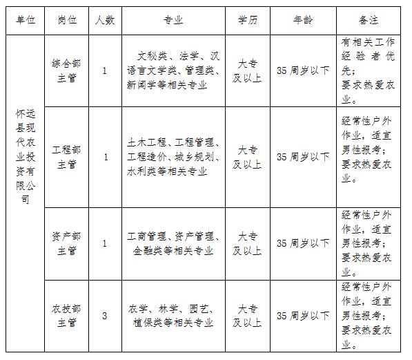 2020-06-19 22:53:01閱讀()懷遠(yuǎn)縣人民政府懷遠(yuǎn)縣現(xiàn)代農(nóng)業(yè)投資有限公司隸屬于懷遠(yuǎn)現(xiàn)代農(nóng)業(yè)綜合開發(fā)示范區(qū),是懷遠(yuǎn)縣政府出資設(shè)立的國有獨(dú)資公司。隨著公司業(yè)務(wù)的發(fā)展,公司現(xiàn)有人員已經(jīng)無法滿足日常工作需求,為了更廣泛地選拔優(yōu)秀人才,擬面向社會(huì)公開招聘6名公司工作人員,具體招聘方案如下: