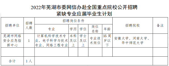 2022年蕪湖市委網(wǎng)信辦赴全國重點(diǎn)院校公開招聘緊缺專業(yè)應(yīng)屆畢業(yè)生工作方案
