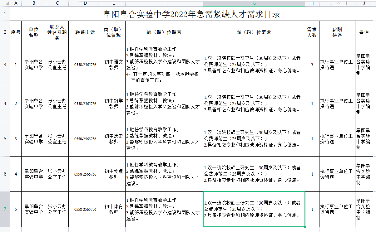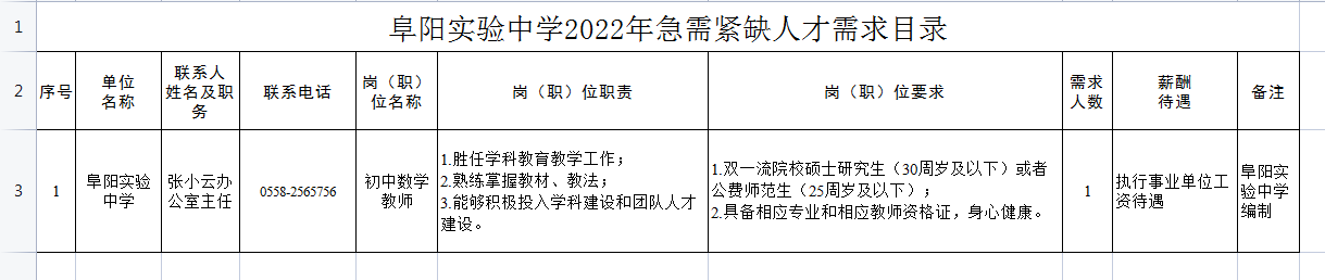 4.崗位需求目錄詳見附件1《阜陽實(shí)驗(yàn)中學(xué)2022年急需緊缺人才需求目錄》、附件2《阜陽阜合實(shí)驗(yàn)中學(xué)2022年急需緊缺人才需求目錄》。