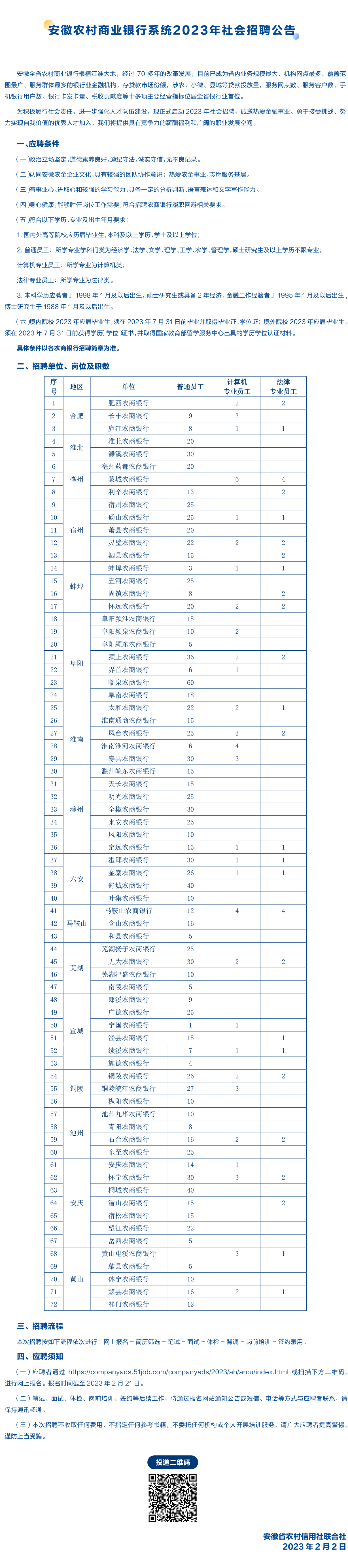 2023年安徽農(nóng)村商業(yè)銀行系統(tǒng)社會招聘公告