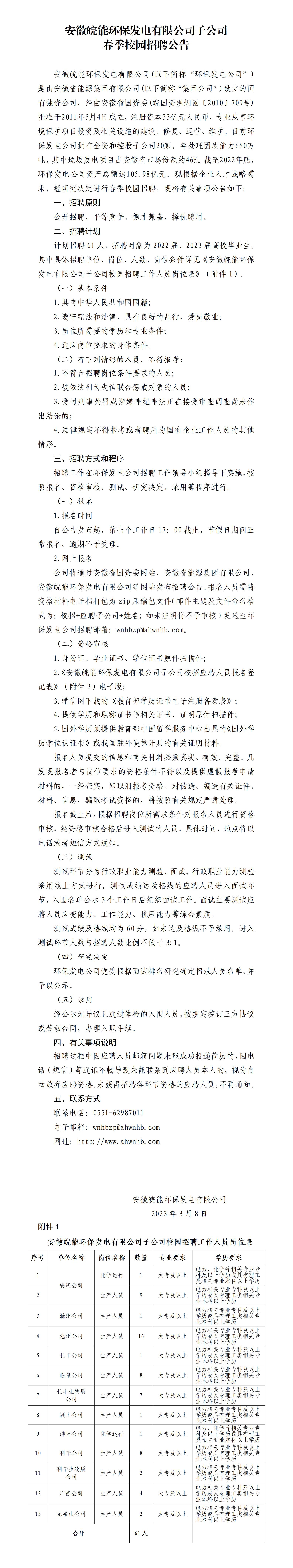 計(jì)劃招聘61人,招聘對(duì)象為2022屆、2023屆高校畢業(yè)生。其中具體招聘單位、崗位、人數(shù)、崗位條件詳見(jiàn)《安徽皖能環(huán)保發(fā)電有限公司子公司校園招聘工作人員崗位表》(附件1)。
