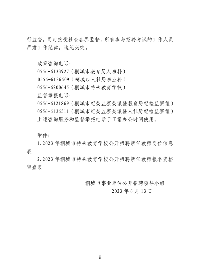 經(jīng)核準(zhǔn),2023年桐城市特殊教育學(xué)校公開(kāi)招聘新任教師計(jì)劃1名。具體招聘崗位、計(jì)劃數(shù)、報(bào)考條件及要求等詳見(jiàn)《2023年桐城市特殊教育學(xué)校公開(kāi)招聘新任教師崗位信息表》(附件1)。