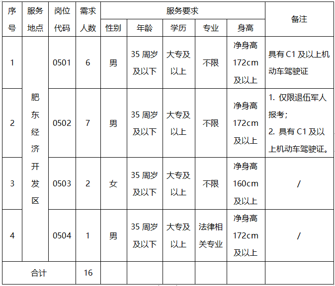 因工作需要,安徽皖信人力資源管理有限公司現(xiàn)面向社會公開招聘城市管理輔助項目服務(wù)人員16名?,F(xiàn)將有關(guān)事項公告如下:
