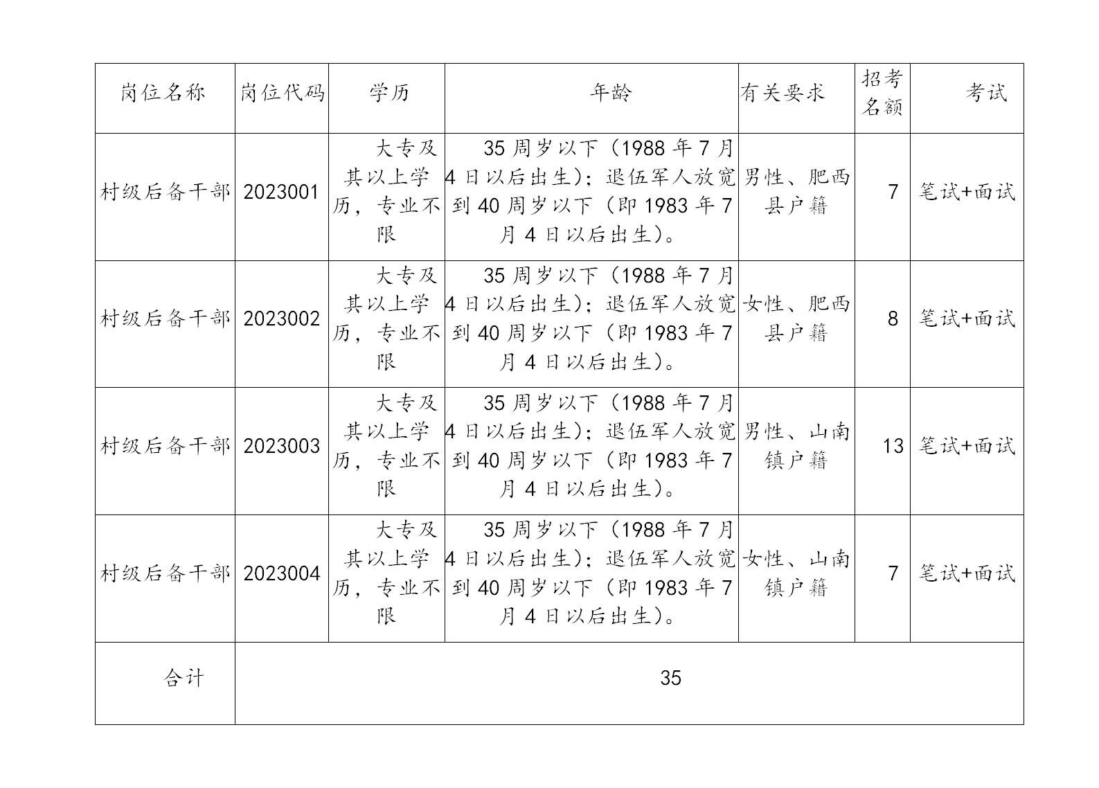 計(jì)劃招考35名村級(jí)后備干部,其中肥西縣戶籍15名;山南鎮(zhèn)戶籍20名。詳見(jiàn)附表。
