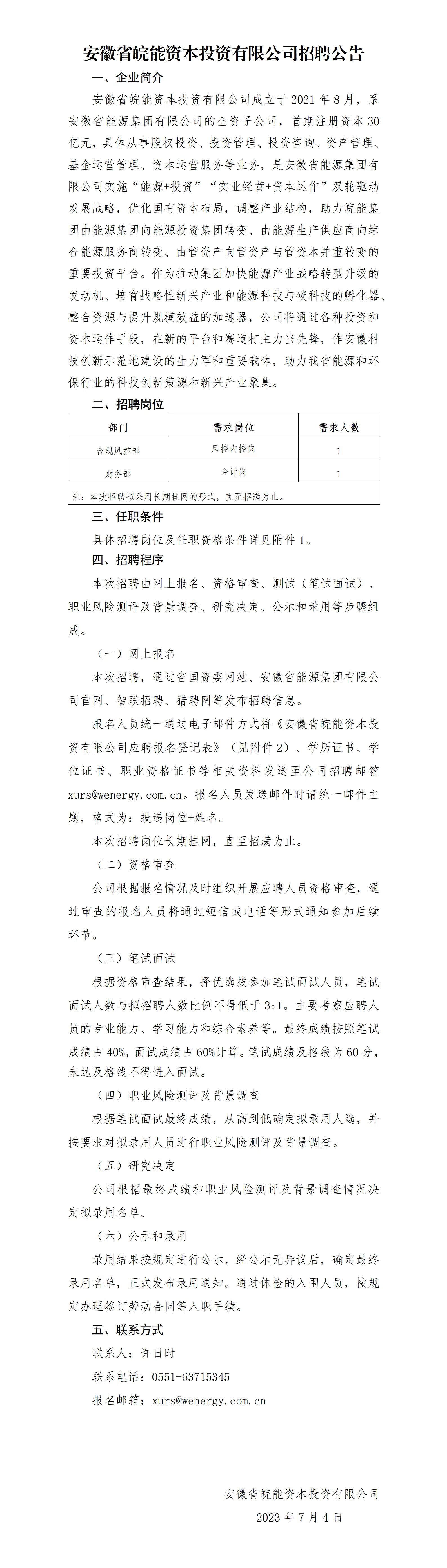 安徽省皖能資本投資有限公司成立于2021年8月,系安徽省能源集團(tuán)有限公司的全資子公司,首期注冊(cè)資本30億元,具體從事股權(quán)投資、投資管理、投資咨詢、資產(chǎn)管理、基金運(yùn)營(yíng)管理、資本運(yùn)營(yíng)服務(wù)等業(yè)務(wù),是安徽省能源集團(tuán)有限公司實(shí)施“能源+投資”“實(shí)業(yè)經(jīng)營(yíng)+資本運(yùn)作”雙輪驅(qū)動(dòng)發(fā)展戰(zhàn)略,優(yōu)化國(guó)有資本布局,調(diào)整產(chǎn)業(yè)結(jié)構(gòu),助力皖能集團(tuán)由能源集團(tuán)向能源投資集團(tuán)轉(zhuǎn)變、由能源生產(chǎn)供應(yīng)商向綜合能源服務(wù)商轉(zhuǎn)變、由管資產(chǎn)向管資產(chǎn)與管資本并重轉(zhuǎn)變的重要投資平臺(tái)。作為推動(dòng)集團(tuán)加快能源產(chǎn)業(yè)戰(zhàn)略轉(zhuǎn)型升級(jí)的發(fā)動(dòng)機(jī)、培育戰(zhàn)略性新興產(chǎn)業(yè)和能源科技與碳科技的孵化器、整合資源與提升規(guī)模效益的加速器,公司將通過各種投資和資本運(yùn)作手段,在新的平臺(tái)和賽道打主力當(dāng)先鋒,作安徽科技創(chuàng)新示范地建設(shè)的生力軍和重要載體,助力我省能源和環(huán)保行業(yè)的科技創(chuàng)新策源和新興產(chǎn)業(yè)聚集。