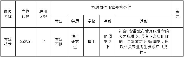 在滿足上述基本條件的前提下,招聘對象還須滿足省委編辦《關(guān)于安徽城市管理職業(yè)學院編制周轉(zhuǎn)池制度試點工作實施方案的批復》中的《安徽城市管理職業(yè)學院人才標準》(附件2)方能報考。