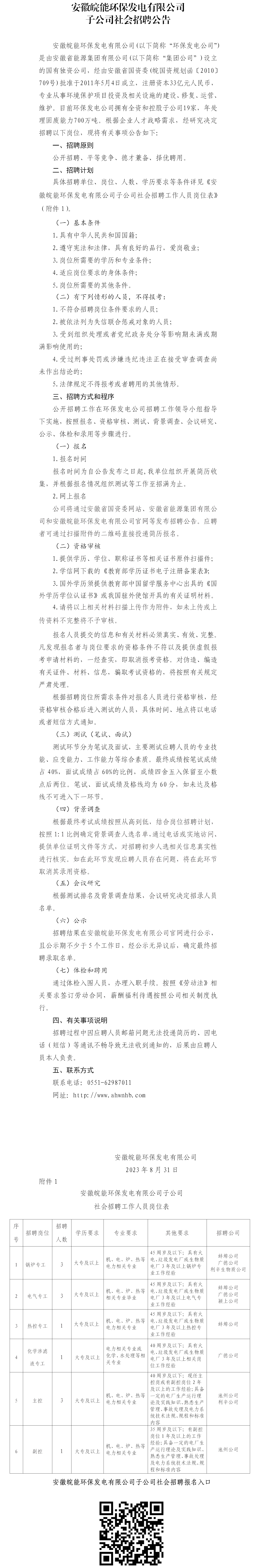 2023年安徽皖能環(huán)保發(fā)電有限公司子公司社會(huì)招聘公告