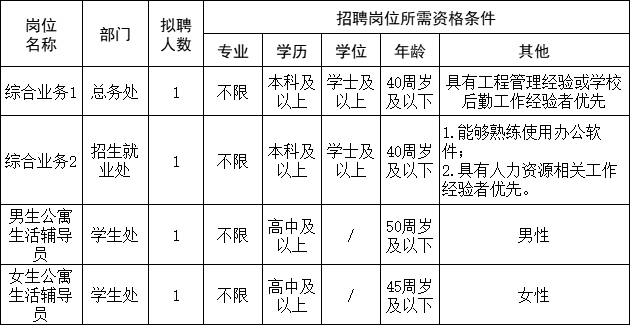 安徽省特殊教育中專學校(以下簡稱省特教中專學校)因發(fā)展需要,現(xiàn)面向社會公開招聘4名編制外工作人員?,F(xiàn)就有關事項公告如下: