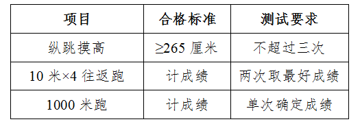體能測試項(xiàng)目:縱跳摸高、4×10米往返跑、1000米跑。測試標(biāo)準(zhǔn)參照《公安機(jī)關(guān)錄用人民警察體能測評項(xiàng)目和標(biāo)準(zhǔn)》執(zhí)行。