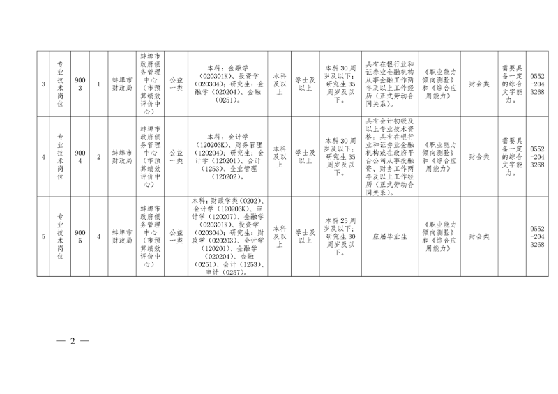 | 4 | 專業(yè)技術(shù)崗位 | 9004 | 2 | 蚌埠市財(cái)政局 | 蚌埠市政府債務(wù)管理中心(市預(yù)算績(jī)效評(píng)價(jià)中心) | 公益一類 | 本科:會(huì)計(jì)學(xué)(120203K)、財(cái)務(wù)管理(120204);研究生:會(huì)計(jì)學(xué)(120201)、會(huì)計(jì)(1253)、企業(yè)管理(120202)。 | 本科及以上 | 學(xué)士及以上 | 本科30周歲及以下;研究生35周歲及以下。 | 具有會(huì)計(jì)初級(jí)及以上專業(yè)技術(shù)資格;具有在銀行業(yè)和證券業(yè)金融機(jī)構(gòu)或在政府平臺(tái)公司從事投融資、財(cái)務(wù)工作兩年及以上工作經(jīng)歷(正式勞動(dòng)合同關(guān)系)。 | 《職業(yè)能力傾向測(cè)驗(yàn)》和《綜合應(yīng)用能力》 | 財(cái)會(huì)類 | 需要具備一定的綜合文字能力。 | 0552-2043268 |