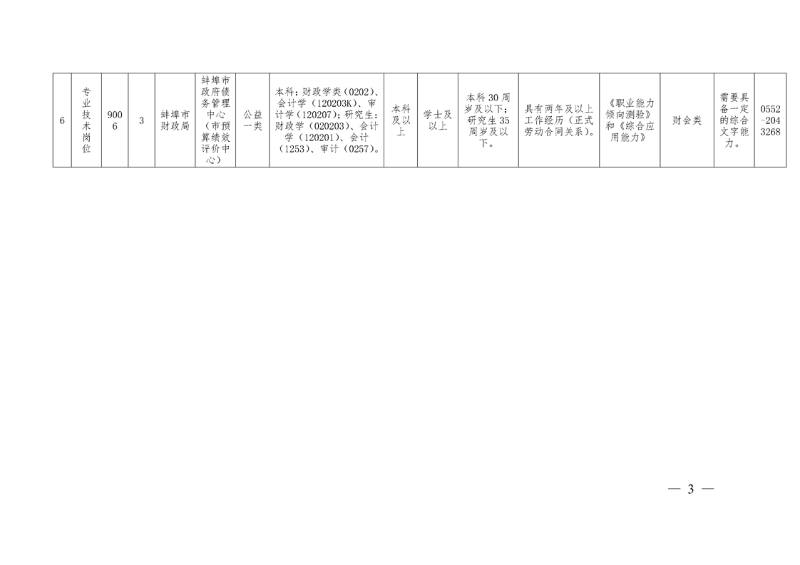 | 6 | 專業(yè)技術(shù)崗位 | 9006 | 3 | 蚌埠市財(cái)政局 | 蚌埠市政府債務(wù)管理中心(市預(yù)算績(jī)效評(píng)價(jià)中心) | 公益一類 | 本科:財(cái)政學(xué)類(0202)、會(huì)計(jì)學(xué)(120203K)、審計(jì)學(xué)(120207);研究生:財(cái)政學(xué)(020203)、會(huì)計(jì)學(xué)(120201)、會(huì)計(jì)(1253)、審計(jì)(0257)。 | 本科及以上 | 學(xué)士及以上 | 本科30周歲及以下;研究生35周歲及以下。 | 具有兩年及以上工作經(jīng)歷(正式勞動(dòng)合同關(guān)系)。 | 《職業(yè)能力傾向測(cè)驗(yàn)》和《綜合應(yīng)用能力》 | 財(cái)會(huì)類 | 需要具備一定的綜合文字能力。 | 0552-2043268 |
